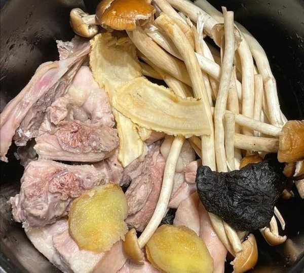食材準備:老鴨,茶樹菇,當歸,熟地,枸杞子,薑片。