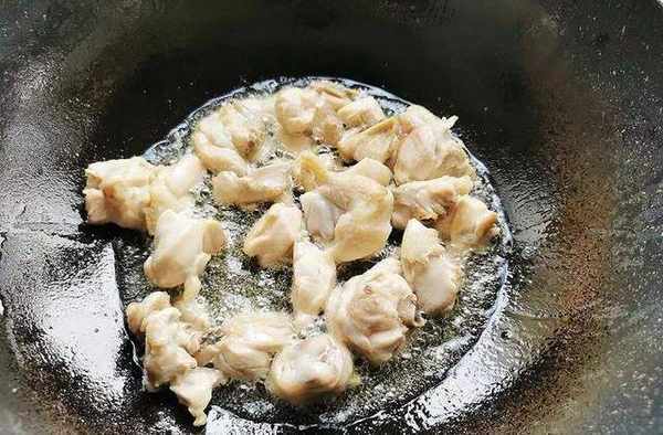 第三步,倒掉鍋中水,刷幹凈,開火將油鍋燒幹,倒油燒至油溫6成熱,下入雞塊翻炒,把雞塊裡的油炒出來一點,炒到雞皮稍微變成金黃色。