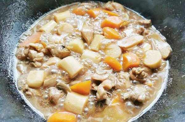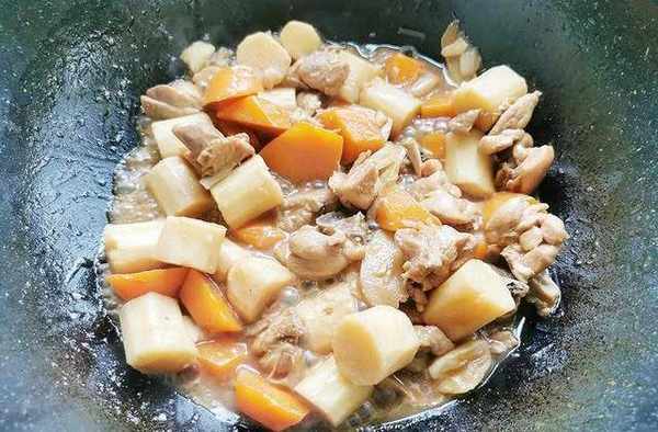 第五步,接著添加沒過雞塊的熱水,水位線高於雞塊1厘米左右即可,轉大火煮開之後轉中小火,蓋上蓋子將雞塊先燜10分鐘,再倒入山藥塊,胡蘿卜塊一起燜20分鐘。