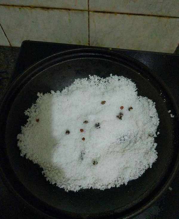 羊肝加點鹽用清水浸泡20分鐘左右,至血水出來,清洗幹凈。用廚房用紙,沾幹水分。起鍋燒熱(馬勺就可以),放入粗鹽,花椒,燒5分鐘左右(註意:不放油,不放水),鹽熱瞭下入羊肝。(平鋪好)