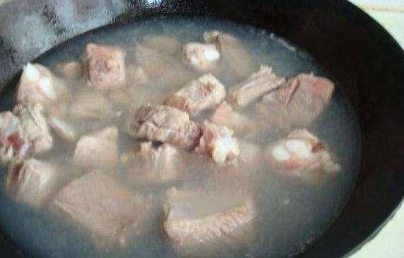 烹飪步驟4:將鍋中加入清水,先加入一些排骨塊,加上一些料酒,加上幾塊生薑片,大火將排骨焯水3到5分鐘,把排骨表面浮沫舀出來,然後將焯水後的排骨,過一遍冷水備用。