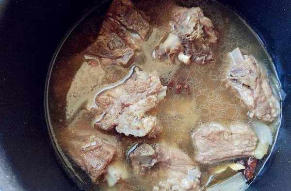 烹飪步驟5:鍋中加上油少許,下一些排骨塊炒一炒,加上一些生薑片和料酒,煸炒片刻,然後將排骨轉到砂鍋燉,加上適量的清水,將排骨煮開。