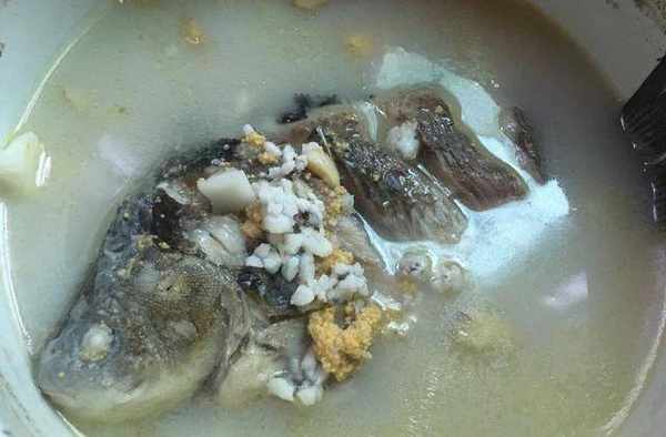 4、將鯽魚裝入砂鍋連同配料放入後加清水至砂鍋8成滿。