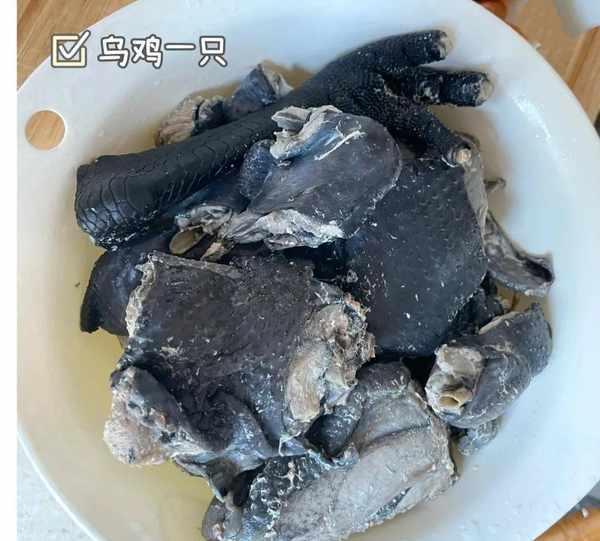 1烏雞洗凈切成大塊,第一步焯水,註意焯水要冷水下鍋,放一瓶蓋料酒,薑片,水開後就關火,將血沫稍微沖洗一下,放一旁備用。