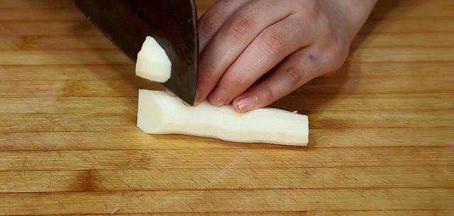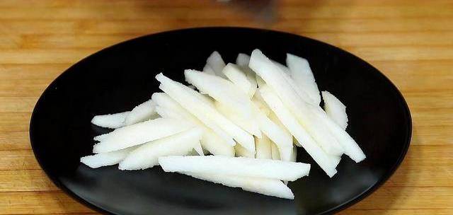 3、將準備好的雪梨清洗幹凈,然後用削皮刀削去外皮,外皮要削得幹凈一點,接著將雪梨沿著雪梨核切成片,最後切成長條,切好的雪梨長條放到一個盤中備用,再把山藥洗凈去皮,然後切成薄片,切完的山藥薄片和雪梨條放到一塊即可。