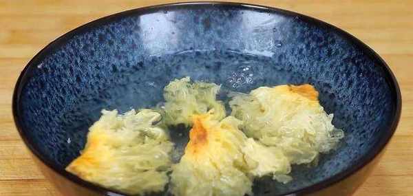 2、首先咱們要將準備好的銀耳處理一下,把準備好的銀耳先掰成小塊,掰成小塊是為瞭讓銀耳更容易泡發,銀耳掰成小塊之後將其放到一個大碗中,然後倒入開水將其泡開。銀耳中倒入開水之後咱們將它放到一旁,然後再來處理一下雪梨。