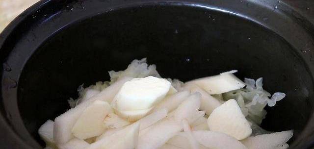 5、銀耳放入砂鍋中之後咱們再把切好的雪梨,山藥片,還有桂圓肉,蓮子全部放到鍋中,接著再把紅棗片放進去,最後再放上兩塊黃冰糖和適量的清水就可以瞭。清水最好要稍微多一點,要沒過各種食材。各種食材全部加進去之後咱們蓋上砂鍋的蓋子,用小火慢熬30分鐘。