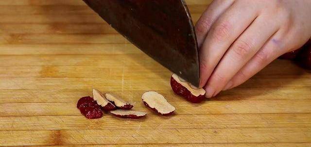 4、再把準備好的紅棗取出來洗凈,然後沿著棗核切碎,切完之後放到盤中備用。等到紅棗,雪梨,還有山藥都切完瞭之後,銀耳就已經泡發好瞭,將泡發好的銀耳的根蒂去掉,然後再將其清洗1~2遍,清洗完成之後擠幹水分,然後放入到一個砂鍋裡。