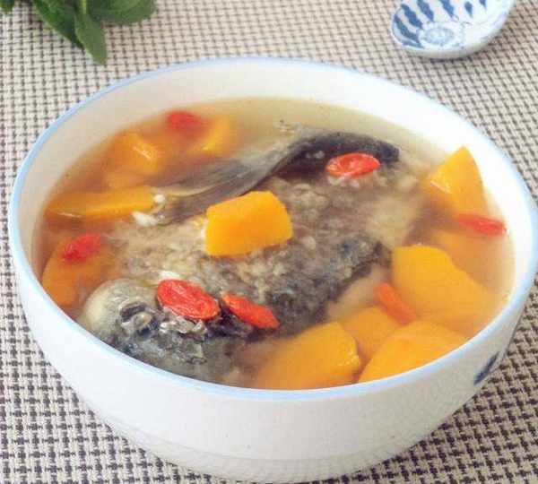 原料:鯽魚、南瓜、蔥、枸杞、薑、蒜、油、鹽、花椒、白胡椒粉。