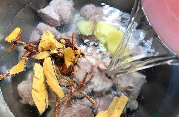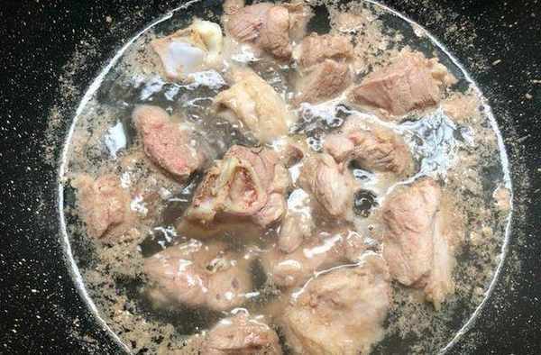 3、把洗幹凈的大骨倒入鍋裡,倒入蓋過食材的水,大火焯出血末關火。
