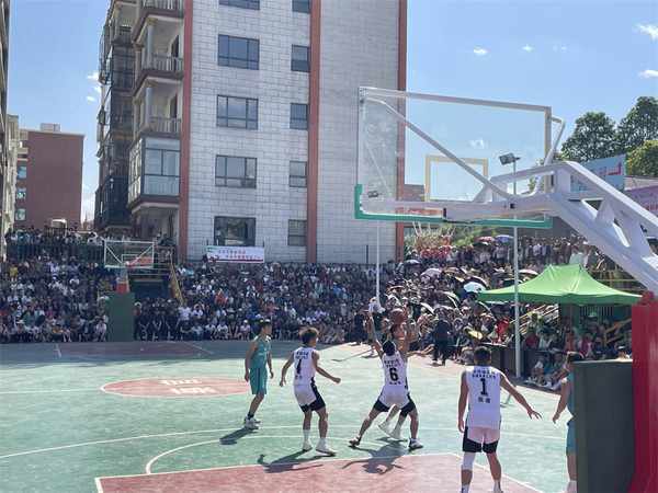作為民族文化美食節系列活動之一,在美食一條街一側,蔡官鎮“村BA”也開展得如火如荼,上千個座位的場地座無虛席。躲閃、上籃、進球……一陣陣歡呼和掌聲響徹現場。