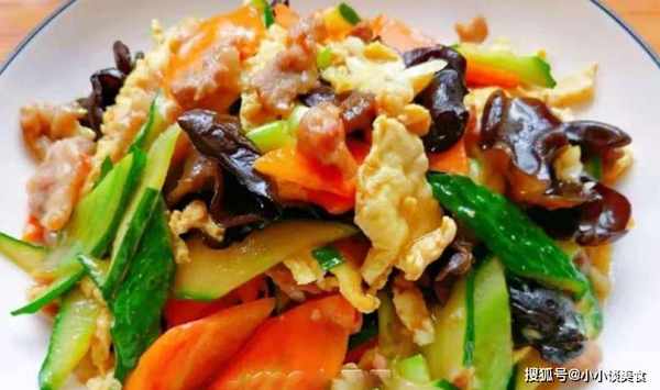 3、雞蛋煎好後關火,鍋留底油,倒入豬肉,炒至變色,加入蔥蒜炒香,倒入黃瓜、胡蘿卜、香菇炒至熟透,蓋上雞蛋,淋上醬汁,炒至湯汁濃稠即可食用。
