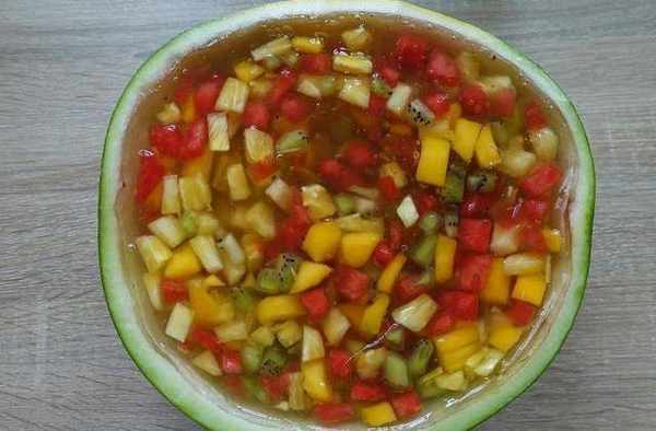 2..攪拌果凍液協助散熱,待溫度稍降,拌起來有勾芡阻力感時,與水果丁一起倒入西瓜皮中。