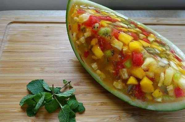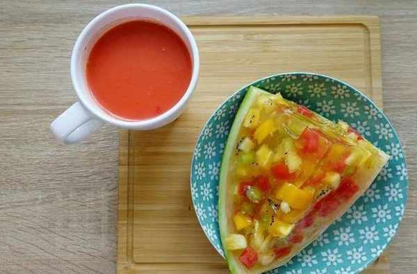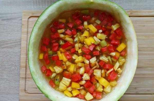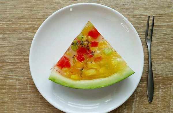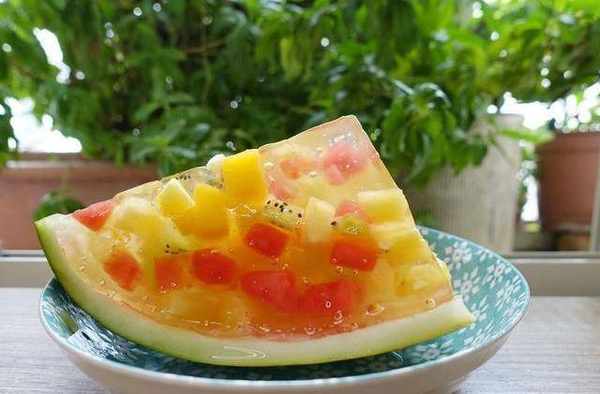 1.可挑選各種顏色水果任意搭配,但應挑選口感軟的水果,如:芒果、奇異果、火龍果、鳳梨、桃子、葡萄…等,質地脆硬的水果如芭樂、蘋果與果凍口感不一致較不適合。2.西瓜盅裝太滿容易導致果凍液溢出,也會增加在冰箱中平穩放置的困難度,故建議裝填至西瓜盅的八分滿即可,待果凍凝固後,再將多餘的西瓜皮切除,如此就可以得到一顆切面平整的西瓜水果凍瞭。
