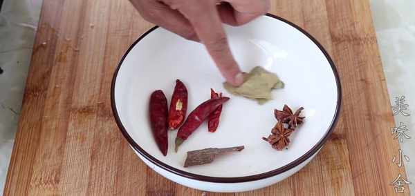 準備的香料有香葉、紅尖椒、桂皮、八角