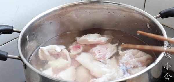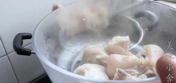現在豬蹄煮的差不多瞭,豬蹄撈出來後用清水多洗幾遍,然後瀝幹水份