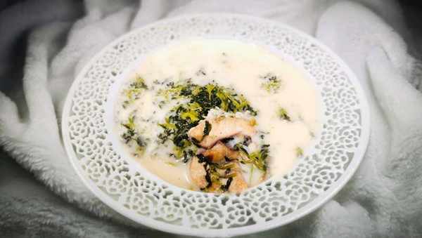 把幹花菇泡發後清洗幹凈,蔥薑炒香加入濃湯,放入花菇,調味後煨制入味備用。