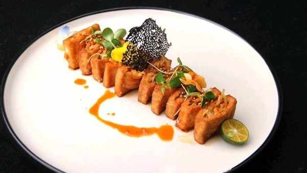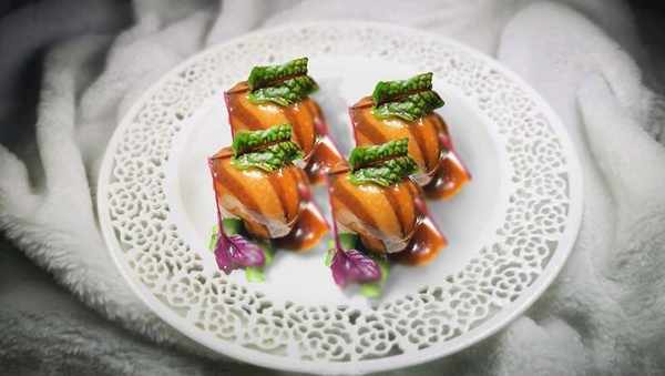 將蘆筍頭一開為二,用油鹽飛水後擺盤,放入花菇濃湯,加入蠔油、白糖調味後勾芡淋入花菇球上,用食用花草點綴即可。