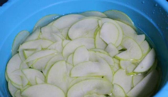 3、拿一個幹凈的洗菜盆,裝入適量清水,擠入檸檬汁,然後放入切好的蘋果片;