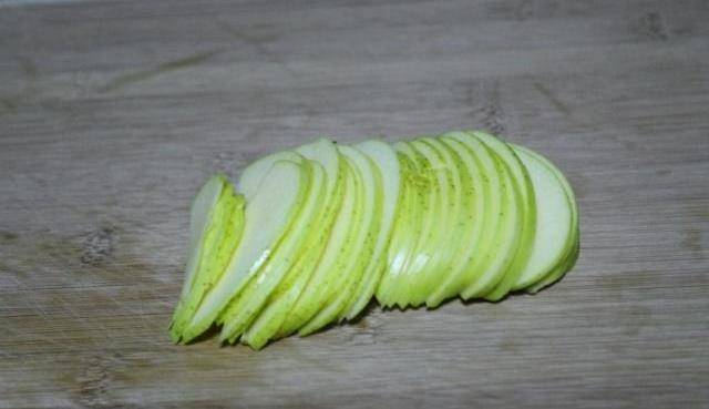 2、用幹凈的刷子反復將蘋果外層表皮刷洗幹凈,再切薄片;
