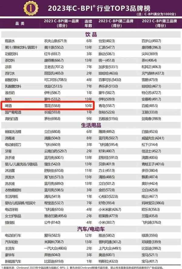 中國品牌力指數(China Brand Power Index,簡稱C-BPI)是基於中國消費者對使用或擁有過的產品或服務反饋意見的基礎上進行的獨立無偏見研究,是測定影響消費者購買行為的品牌力指數,2011年推出並連續數年獲得工業和信息化部品牌政策專項資金的扶持,深受中國消費者和企業信賴。2023年C-BPI調查區域覆蓋全國100個城市,總樣本數量近232萬個,采用線上線下相結合的調研方式完成。雪花啤酒再一次脫穎而出。
