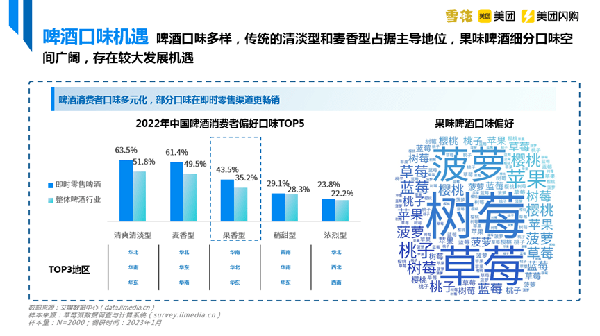 啤酒口味多樣,傳統的清淡型和麥香型占據主導地位。華潤雪花啤酒聯合和美團閃購及iiMedia Research(艾媒咨詢)發佈的白皮書數據顯示,中國啤酒消費者偏好口味主要有清爽清淡型、麥香型、果香型、稍甜型等。在即時零售渠道中,有63.5%的消費者選擇清爽清淡型啤酒;果香型作為後起之秀,也有將近五成消費者選擇。果味啤酒細分口味空間廣闊,存在較大機遇。