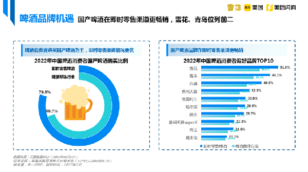 與此同時,中國啤酒企積極佈局線上營銷,營收效果明顯。華潤雪花啤酒聯合和美團閃購及iiMedia Research(艾媒咨詢)發佈的白皮書數據顯示,消費者購買啤酒主要以國產為主,即時零售渠道銷售情況較好,購買比例為79.5%;在消費者偏好品牌中,雪花、青島、百威位列前三,其中華潤雪花啤酒有51.8%消費者從即時零售渠道購買。