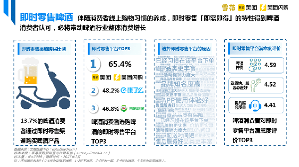 得益於即時零售的發展,啤酒品牌獲得發展紅利。以美團閃購為代表的即時零售平臺一頭連接品牌商,一頭連接零售商,打破傳統門店的時空限制。通過數字化運營,鏈接到更多消費者,提高商流和信息流的流動效率,“零售+科技”戰略正為零售企業和品牌商創造新的增量空間和價值鏈條。