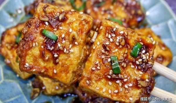 2、豆腐切片,先糊面粉,再糊蛋液,鍋裡油燒熱至60%熱,放入豆腐煎至兩面金黃,淋上醬汁至濃稠,撒上芝麻。然後撒上蔥花