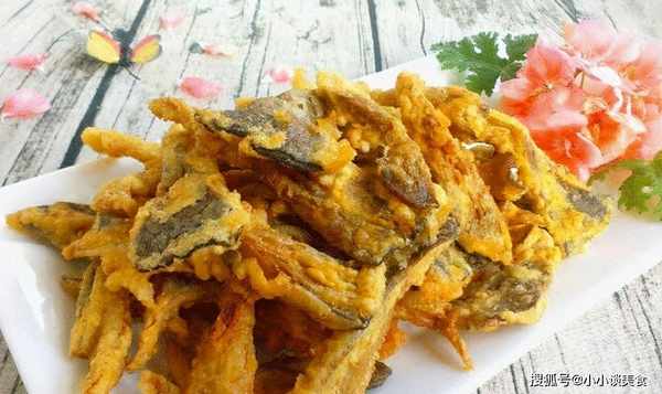 7、鍋裡放油燒熱,將香菇一粒一粒浸入蛋液中炸至金黃。