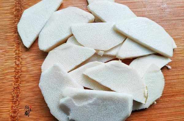步驟一:首先用刀從筍頭到尾劃一刀,用手一剝筍殼就輕松剝去,用刀削去老根洗凈,對半切開切成薄片。