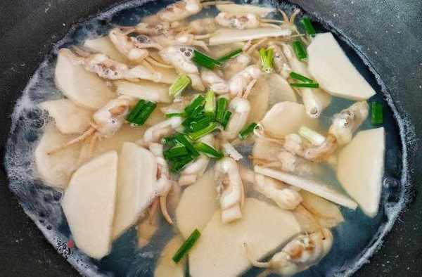 步驟六:綠竹筍煮上10分鐘後就熟透瞭,倒入蟶子肉再煮上2-3分鐘。註意:綠竹筍是非常好吃的一種竹筍,是沒有苦澀味的,是不用焯水的,除瞭綠竹筍,其它什麼竹筍都需要焯水,因為竹筍中含有一種草酸鈣,不容易消化,並且還會對胃黏膜造成強烈刺激,在吃筍的過程中會有苦澀的味道,其實這就是草酸鈣存在的影響,所以竹筍烹飪之前一定要焯水。