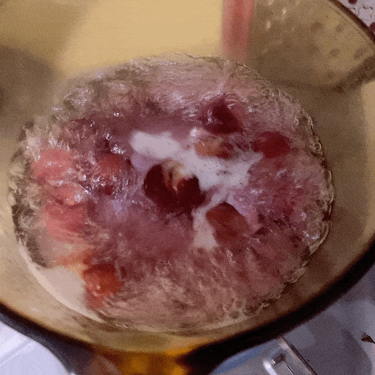 冷水下鍋,煮開後再小火慢煮10分鐘,期間可以用勺子把櫻桃的果肉碾開。