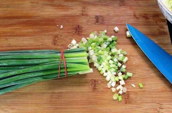 2.蔥切末。可綁橡皮筋固定蔥方便切,每切一段後,再將橡皮筋往後挪,直到切完這樣切的比較均勻。