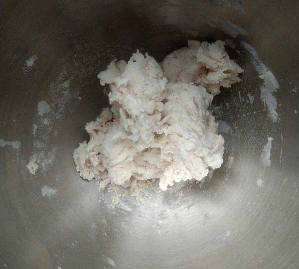 第3步、邊加水邊用筷子攪拌成棉絮狀,利用手或機器揉面,揉到三光。