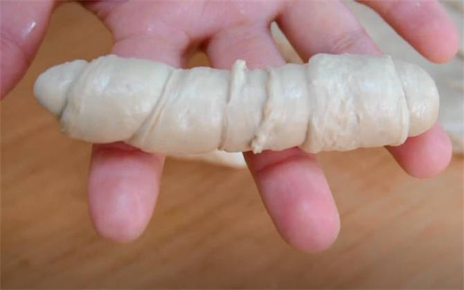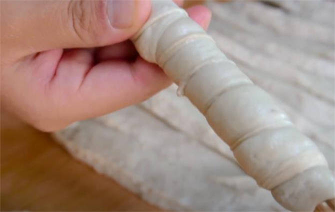 8.咱們利用一根筷子,把面筋穿進去,利用一個小刀這樣旋轉著劃下去,往下扯一扯。