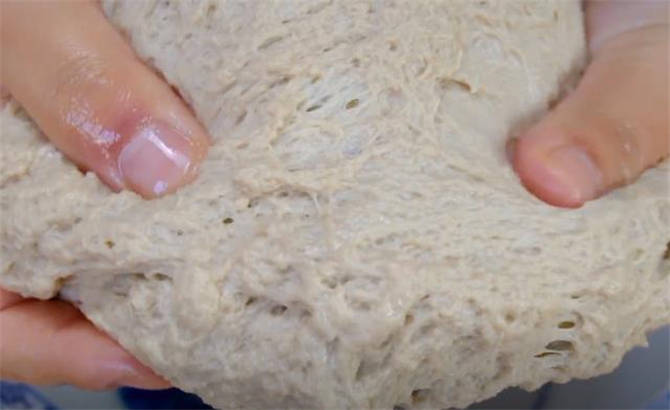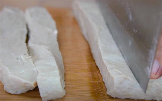 4.現在這個面筋已經餳好瞭,整理成長方形,整理好之後就可以切長條瞭。