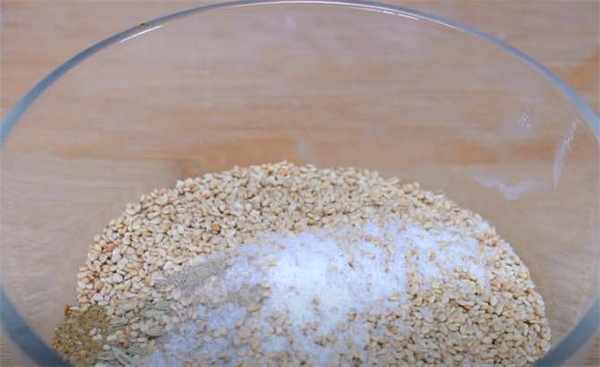 2.這個時間我們調一個燒烤醬,先放兩勺的豆瓣醬,加一些素蠔油,花椒面,孜然粉,十三香,小茴香,味精,白胡椒粉,黑胡椒粉,白芝麻,一勺鹽攪勻。