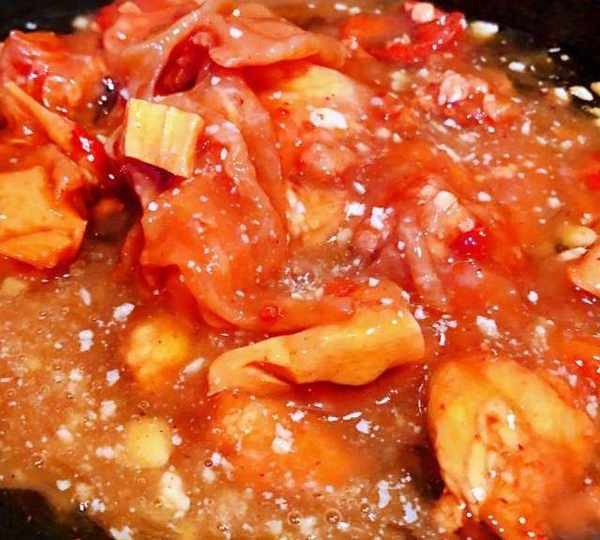 第5步、買煮好的牛雜倒入鍋中加熱。