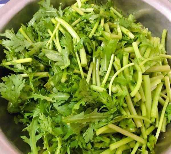 第3步、茼蒿摘好洗凈瀝幹水份切成小段。
