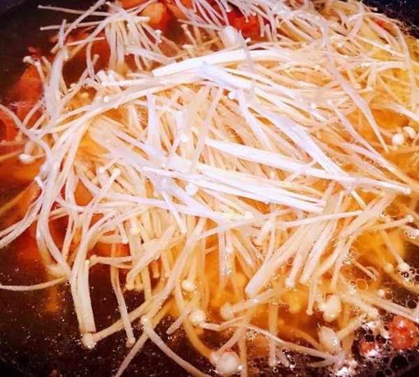 第6步、添加適量清水燒開放入金針菇中火煮。