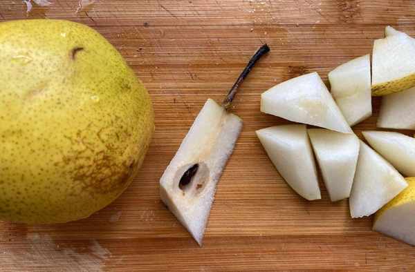 所有食材都準備好,蘋果梨分別用水浸濕後在蘋果和雪梨表面倒入適量的食用鹽搓洗1-2分鐘後清洗幹凈,分別用刀把蘋果和雪梨切成小塊備用。用鹽搓洗蘋果和梨表面可以快速把蘋果梨表面的臟東西徹底清洗幹凈。