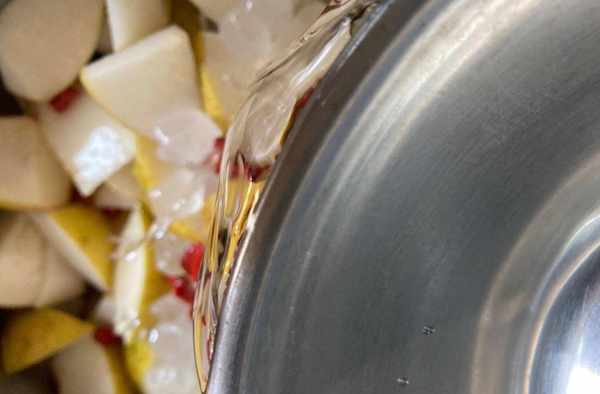 枸杞清洗幹凈表面灰塵,和切好的蘋果塊,梨塊分別放入一個煮鍋內備用。