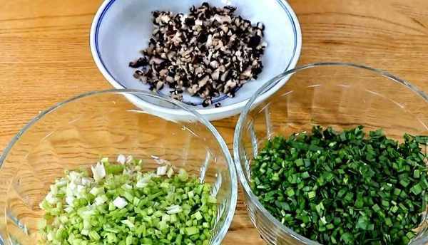 首先準備二斤豬肉,將豬肉剁成肉泥,可以不用剁得太細膩,有點顆粒感更好吃,加一點料酒、生抽和蠔油,加胡椒粉和鹽,再撒一點雞精,用筷子順著一個方向攪拌,給肉上勁,準備一碗蔥薑清水,用手抓出蔥薑汁,過濾幾次就將蔥薑水分三次倒入肉餡中,用筷子攪拌一下,每倒一次都要等肉餡充分吸收後再加,也是用筷子順著一個方向攪拌,芹菜清洗幹凈後切成碎,韭菜也清洗幹凈後切成碎,把發好的幹香菇切成丁,將調好的肉餡淋一點香油,再將肉餡分別加入芹菜、香菇和韭菜的碗裡,都攪拌均勻,將三種餡都放到冰箱裡冷藏三十分鐘。