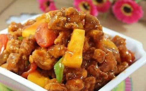 4、平底鍋放油燒熱,倒入肉塊用大火煎1分鐘,倒入油,倒入番茄醬、白醋、糖倒入鍋中。請再多一點。加鹽,將淀粉倒入水中,煮沸後調成酸甜汁(酸甜看個人口味,太甜加白醋,太酸加白糖),淋在菠蘿上,小西紅柿,青椒,拌勻,關火,倒入炸好的肉塊快速攪拌混合。