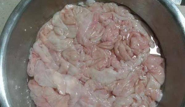 三、準備一個容器,把大腸放進去,然後放入適量的食鹽和面粉,再倒上點水,用手使勁揉搓大腸。直到出現瞭很多膠液,在用水沖洗幾遍,直到沖洗幹凈為止。