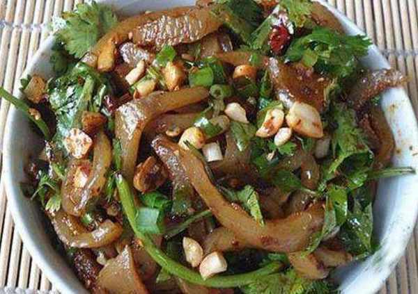 食材:豬皮、鹽、蔥、薑、八角、香油、白糖、香菜、醋、辣椒油。步驟如下: