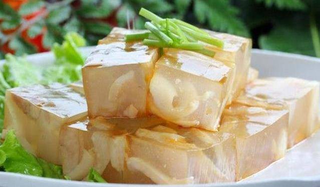 3、倒出在盒子中,放入冷藏一個晚上就可以瞭。第二天拿出來切塊,拌上醬料食用。