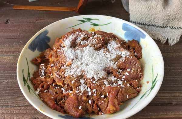 3、醃制完成後倒去牛肉的汁水,加入少許的淀粉(生粉和地瓜粉都可以)再加入少許的熟油一起抓勻備用