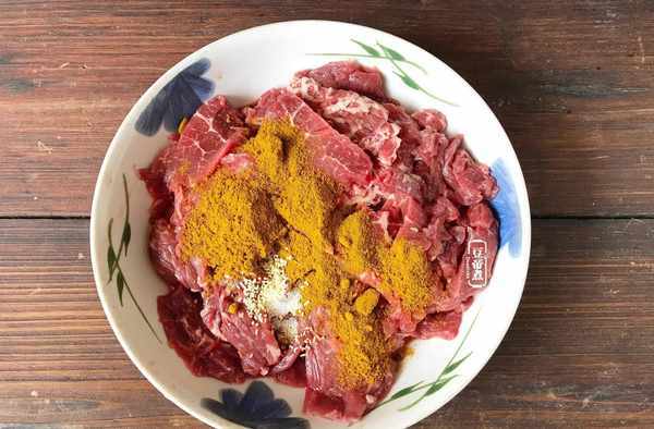 2、把牛肉切成薄片,加入2匙的咖喱粉及少許的鹽、雞精抓捏均勻醃制15分鐘。